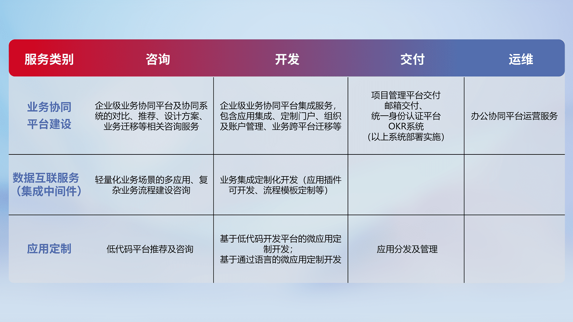 针对钉钉、、、企微、、、、IDaas等平台级产品提供产品的规划、、方案、、、交付、、定制化开发等服务,,实现如统一协同办公、、、智能客户服务、、、、混合会议管理、、智能数据查询、、等业务场景,,,实现数字化转型。。。。